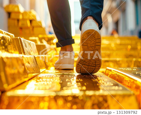 投資に成功した若い投資家のイメージ 空まで続くインゴットで作られた階段を嬉しそうに勢いよく登ってい