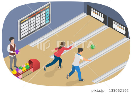 3D Isometric Flat Vector Illustration of Playing Bowling, Young People, Throwing Balls To Knock Down Pins.