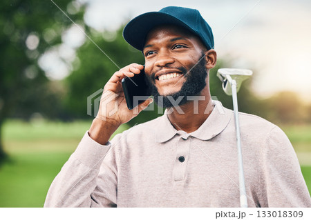 Man, phone call and conversation on golf course, communication and plan for training. Black male person, talking and athlete for networking outdoors, golfer and sports connection or speak on tech