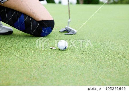 ゴルフイメージ グリーンでボールのマーキングをする女性手元