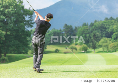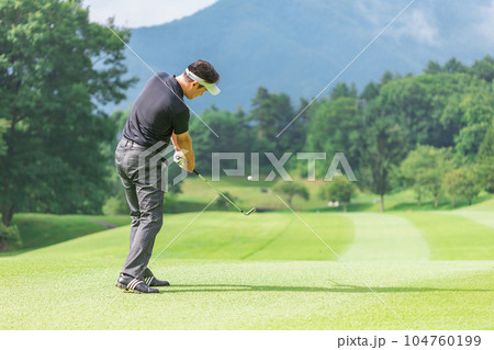 ゴルフ場でアイアンショットをするゴルファーの男性