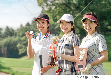 ゴルフ場でゴルフコンペ・大会・賞をもらうゴルファーの女性