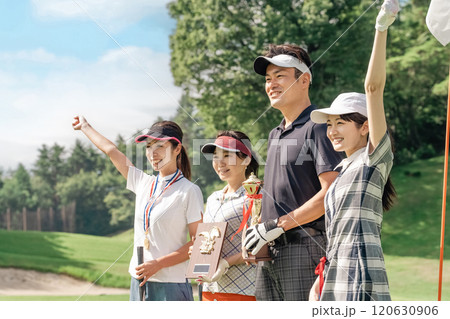 ゴルフ場でゴルフコンペ・大会・賞をもらうゴルファーの男女
