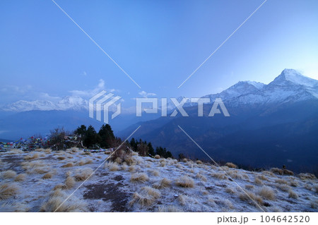 南アジアのネパール ヒマラヤ山脈眺望の名所プーンヒル展望台から夜明け前のアンナプルナとダウラギリ