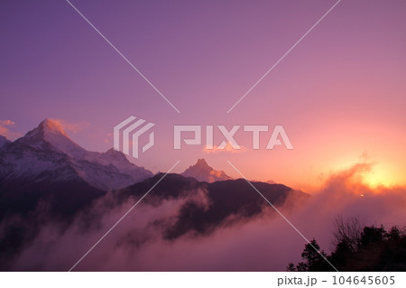 南アジアのネパール ヒマラヤ眺望の名所プーンヒルから夜明けのアンナプルナ山群とマチャプチャレの景色