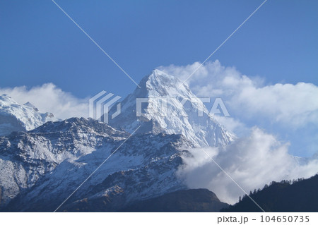 南アジアのネパール ヒマラヤ山脈のトレッキングコース沿いのゴレパニ村からのアンナプルナサウス山頂