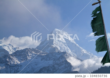 南アジアのネパール ヒマラヤ山脈眺望の名所プーンヒルから夜明けのダウラギリ山群とタルチョーの景色