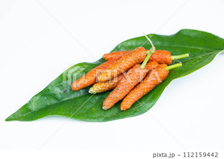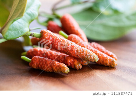 乾燥ヒハツと葉っぱ。右下コメント、コピースペース。