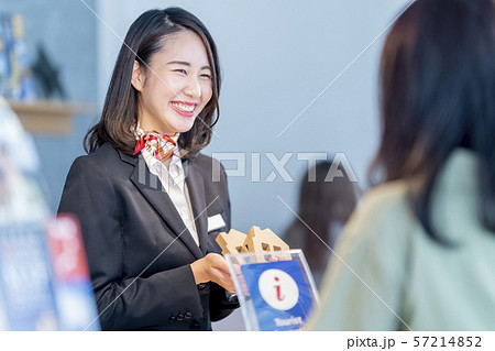 外国人観光客を笑顔でおもてなしタブレットで案内女性観光ガイドスタッフ