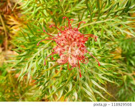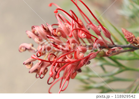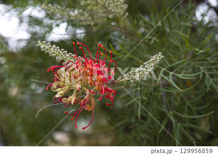 赤い花が咲いた常緑低木のグレビレア・ロビンゴードン