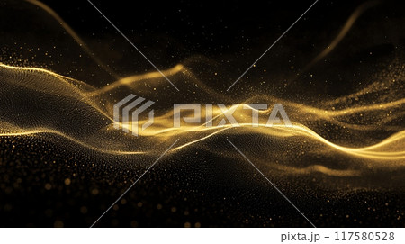 Golden particles forming ethereal waves on a dark background, perfect for a magical and elegant backdrop.