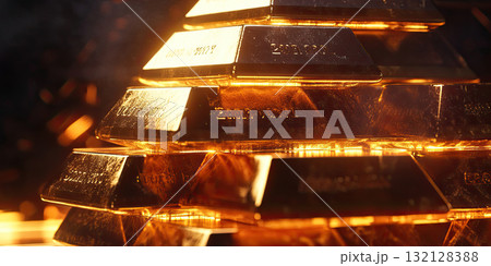 Golden Christmas tree adorned with glowing lights and ornaments in a festive evening setting. High quality photo