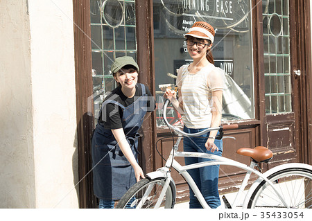 おしゃれな店舗のエントランス 大きなガラスドアと自転車