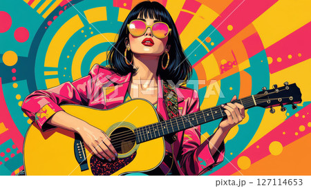 カラフルなレトロ背景とギターを弾くポップアート風の女性