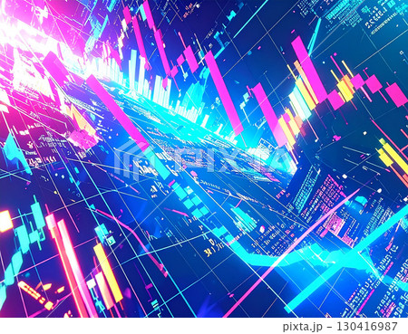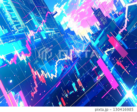 デジタル都市の鼓動を思わせる株価チャートやデジタルな模様が踊るサイバーパンクな風景