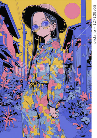 花柄の着物風ドレスを着たサイケデリックな少女