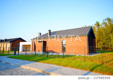 Modern Barnhouse in suburban. Barn raising. Suburb houses Rows along road. Prefab house