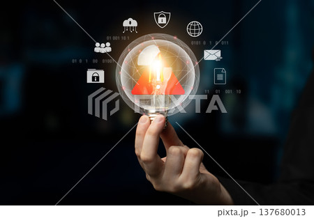 System Warning Alert and Cybersecurity Threat Concept. A person using laptop with system warning and exclamation triangles red, symbolizing cyber security alerts, system failure, and critical threats.