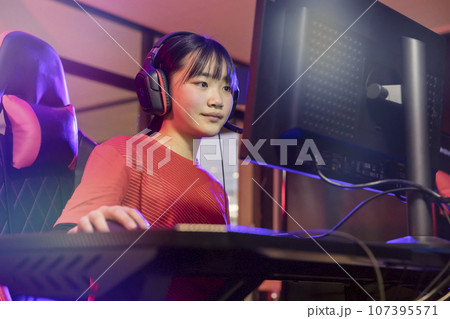 eスポーツイメージ ゲーミングヘッドホンを装着する笑顔の女の子