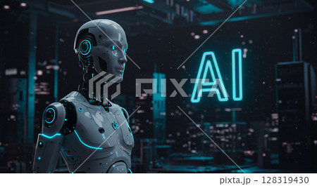 ホログラムスクリーンに向かって働く人間型ロボット AI 人工知能