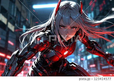 未来的な都市を背景に、銀髪の美しいサイボーグ少女が、発光する機械装甲と虹彩に輝く瞳で鋭い横顔を見せる