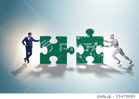 Robot versus human. People compete and collaborate with androids. Artificial intelligence victory in completing tasks. Business teamwork. Person and cyborg rivalry. Garish vector set