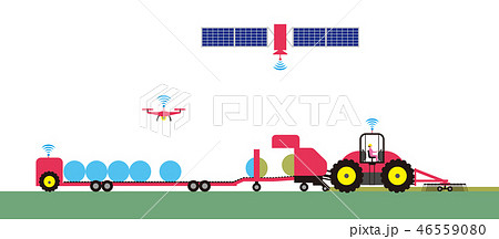 スマート農業。自動化された農業用トラクターと牧草収穫。