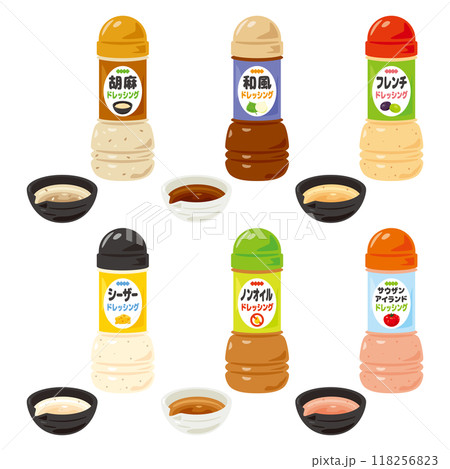 色々な種類のボトル入りのドレッシングセット