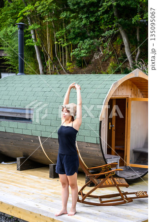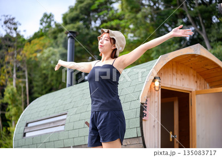 樽型サウナで深呼吸する女性 【撮影協力:隠岐シーサイドリゾートみやび様】
