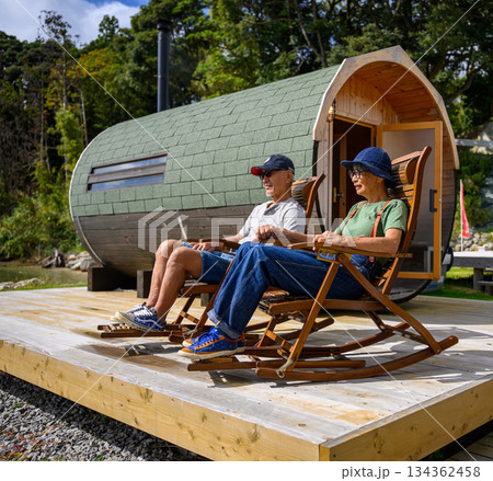 高齢夫婦、サウナ小屋前でリラックス【撮影協力:隠岐シーサイドホテルみやび】