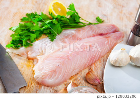 Raw pink cusk-eel fish fillet, seafood ingredients