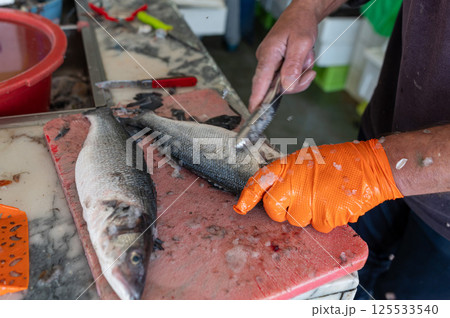 A person skillfully fillets fish at a busy market to prepare fresh seafood for customers.