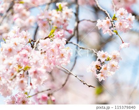 春本番 美しく咲いた満開の桜に蜜を集めに来たかわいいミツバチ