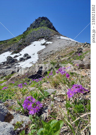 エゾコザクラと硫黄山(北海道・知床)