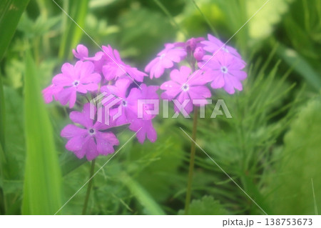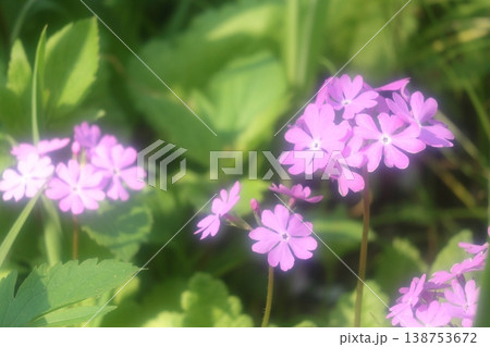 群生しているサクラソウのピンクの花