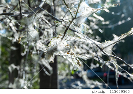 A tree in an urban environment is shrouded in cobwebs due to infestation with ermine bird cherry moth larvae.