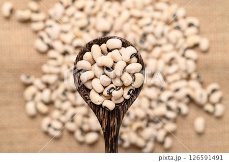 Black-eyed pea or cowpea in wooden spoon, Food ingredient, Top view