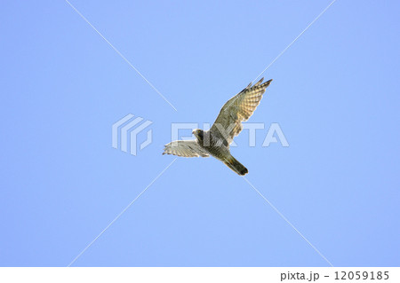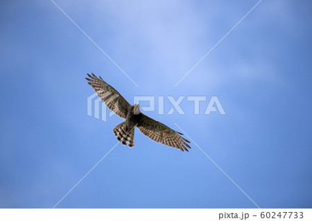 青空をバックに飛翔する渡り途中のサシバ成鳥