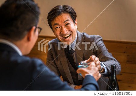 居酒屋・飲み屋でお猪口で乾杯するサラリーマン(酔っ払い・からみ酒)
