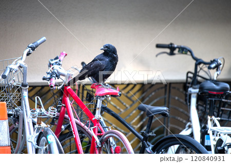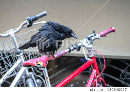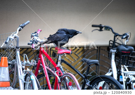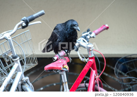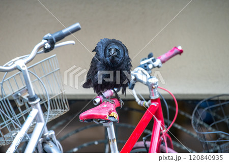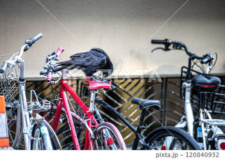 日本の横浜都市景観 傷んだり、経年劣化でひび割れた自転車のサドルをついばみ、中をほじくり出すカラス…