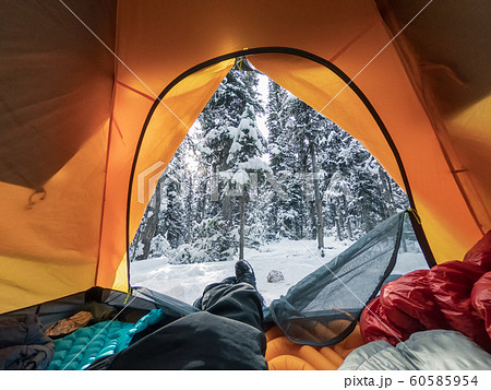 Traveler stretching the legs in tent on snowy pine