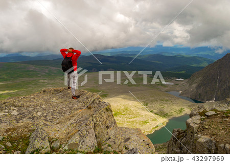Traveller on the peak of high rocks in autumn. Sport and active life concept