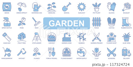 Garden icons set in duotone outline stroke design for web. Pack pictograms of seeds, green sprout, watering can, seedling, shovel, pot plant, gloves, bouquet, rose, rake, other. Vector illustration.