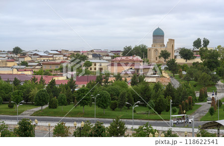 The Samarkand city in Uzbekistan with houses and a medieval mosque with dome and arabic inscriptions