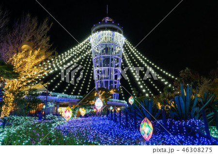 神奈川県藤沢市 江の島夜景 シーキャンドル(展望灯台)とサムエル・コッキング苑湘南キャンドル