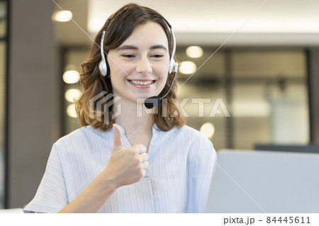 パソコンの画面に向かって親指を上げる笑顔の外国人女性