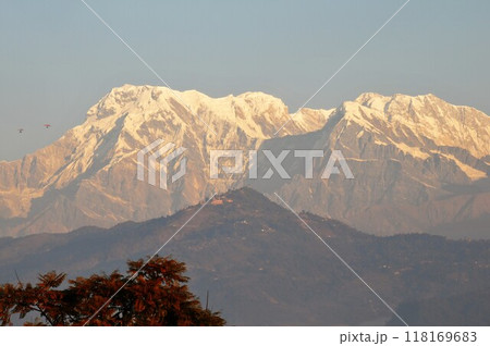 南アジアのネパールポカラ 街の建物屋上から夜明けのアンナプルナ山群とサランコットの丘の景色
