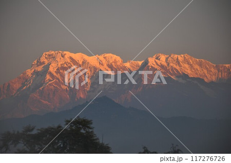 ネパール、ポカラ、サランコットの丘、ヒマラヤ山脈、夕日を浴びるアンナプルナサウス