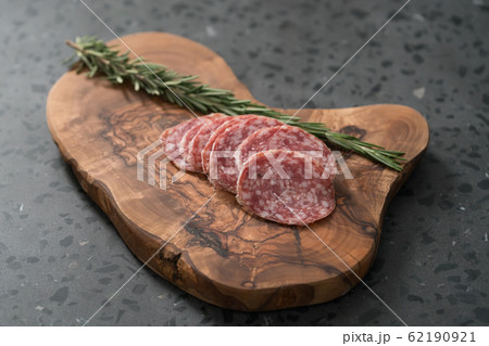 Sliced salame milano sausage on olive wood board with rosemary and pepper
