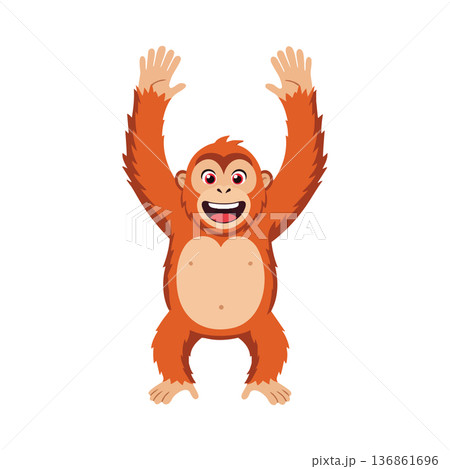 Happy playful monkey character with raised arms and expressive face vector illustration for kids and wildlife designs